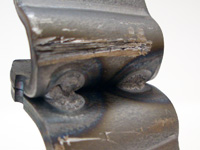 スポット溶接の場合は溶接部の冷却が極めて速いため、等価酸素炭素量Capが0.2%以上になると溶接部に焼きが入り硬化します。 溶接熱影響、特に冷却速度に敏感な硬化性材料であるので、適正強さとじん性を得るには、溶接後熱処理を行う必要があります。 熱処理を行わないと、オーステナイトまで、加熱された溶接部及びその周辺が急冷されてマルテンサイトとなるため、引張りせん断強さは高いが延性比(=引張強さ / 引張せん断強さ)がはなはだしく低下する為、溶接部及びその周辺の硬さはHv300をこす場合、一般的に溶接技術上の配慮が必要となります。