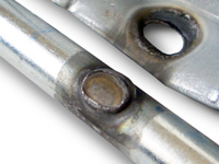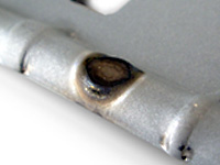 電気めっきにより亜鉛を付着させたもので、亜鉛付着量は、10・20・30 g/m2などのものがあります。耐食性は劣るので、そのまま屋外曝露の用途には不適ですが、加工性・塗料の密着性・溶接性にすぐれ、広範囲な用途を有しています。 溶融亜鉛めっき鋼板同様に電極へ亜鉛が容易に付着し、汚損耗を助長し、連続打点に悪影響を及ぼします。 亜鉛めっき鋼板に対して電極は一般的に価格的にもクロム銅、ジルコニウム銅を使用しますが、アルミナ分散強化銅がより効果があります。熱伝導率の高いものが望ましく、電極チップの冷却が大切です。